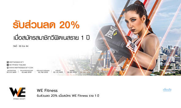 - ใช้รหัสส่วนลด 20% เมื่อสมัครสมาชิก WE Fitness Society รายปี จากราคาปกติ ที่ WE Fitness Society ทุกสาขา ได้ตั้งแต่วันที่ 19 พ.ย. 64 - 31 มี.ค. 65 โดยเปิดให้บริการตั้งแต่เวลา 08.00 -20.30 น. ทุกวัน