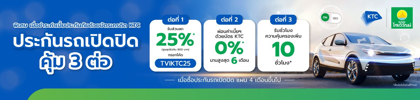 ● รายการส่งเสริมการขายนี้ใช้สำหรับรถยนต์ที่ทำประกันภัยกับบริษัทเป็นครั้งแรก หรือรถยนต์ที่กรมธรรม์เดิมขาดต่ออายุเกินกว่า 365 วันขึ้นไป นับตั้งแต่วันที่สิ้นสุดความคุ้มครองกับประกันภัยไทยวิวัฒน์ และทำรายการซื้อประกันรถเปิดปิด ที่เข้าร่วมรายการส่งเสริมการขาย ประเภทความคุ้มครองชั้น 1, 2+, 3+