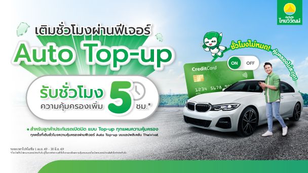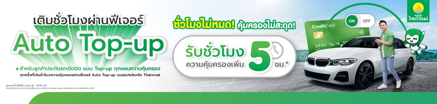 สำหรับลูกค้าประกันรถเปิดปิด ทุกแผนที่เข้าร่วมรายการ และเติมชั่วโมงความคุ้มครองผ่านฟีเจอร์ Auto Top-up บนแอปพลิเคชัน Thaivivat รับชั่วโมงความคุ้มครองเพิ่ม 5 ชั่วโมง อัตโนมัติ
