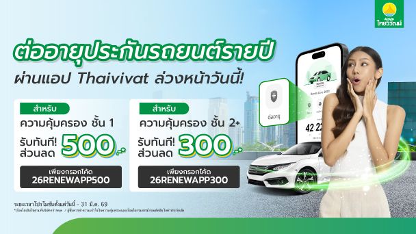 ● ต่ออายุกรมธรรม์ ประกันรถยนต์รายปี ภาคสมัครใจ (ไม่รวม พ.ร.บ.) ประเภทความคุ้มครอง ชั้น 1, 2+ ล่วงหน้า ผ่านช่องทางแอปพลิเคชัน Thaivivat เท่านั้น ตั้งแต่วันที่ 1 กุมภาพันธ์ - 31 มีนาคม 2569 รับส่วนลดค่าเบี้ยฯ สูงสุด 500 บาท โดยมีขั้นตอน และเงื่อนไข ดังนี้