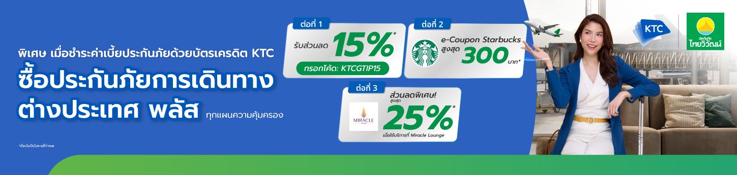 ● สำหรับลูกค้าที่เป็นสมาชิกบัตรเครดิต KTC ซื้อประกันภัยการเดินทางต่างประเทศ พลัส แบบรายเที่ยว/รายปี หรือประกันเดินทางต่างประเทศพลัส เปิด-ปิด ทุกแผนความคุ้มครอง กับประกันภัยไทยวิวัฒน์ เท่านั้น
