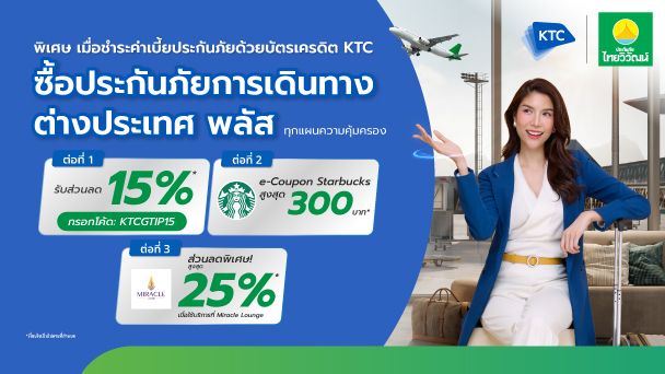 ● รายการส่งเสริมการขายนี้สำหรับลูกค้าที่เป็นสมาชิกบัตรเครดิต KTC ซื้อกรมธรรม์ประกันภัยการเดินทางต่างประเทศ พลัส แบบรายเที่ยว/รายปี หรือประกันภัยการเดินทางต่างประเทศพลัส เปิด-ปิด ทุกแผนความคุ้มครอง กับประกันภัยไทยวิวัฒน์ โดยชำระค่าเบี้ยประกันภัยครบจำนวน ผ่านบัตรเครดิต KTC