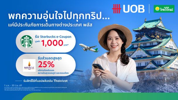 ● สำหรับลูกค้าธนาคารยูโอบี จำกัด (มหาชน) ที่ทำรายการซื้อประกันภัยการเดินทางต่างประเทศพลัส แบบรายเที่ยว/รายปี ทุกแผนความคุ้มครอง ตั้งแต่วันที่ 1 มกราคม - 30 มิถุนายน 2569