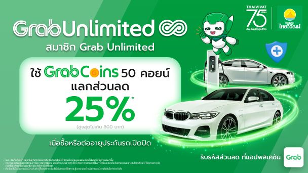 ● สำหรับสมาชิก Grab Unlimited ที่ทำรายการซื้อใหม่ หรือต่ออายุกรมธรรม์ประกันรถเปิดปิด หรือประกันรถเปิดปิด EV ที่เข้าร่วมรายการ ประเภทความคุ้มครองชั้น 1, 2+, 3+ กับประกันภัยไทยวิวัฒน์ รับส่วนลดค่าเบี้ยฯ 25% สูงสุด 800 บาท ตั้งแต่วันที่ 1 มกราคม – 31 ธันวาคม 2569 โดยมีขั้นตอน และเงื่อนไขดังนี้