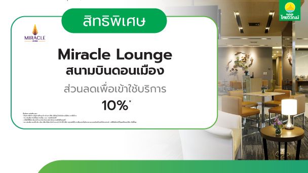 ○ สิทธิ์ส่วนลด 10% ใช้บริการได้ที่ Miracle Lounge ดอนเมือง โดยสามารถใช้สิทธิ์ได้ ไม่จำกัดจำนวนผู้เดินทาง ดังนี้