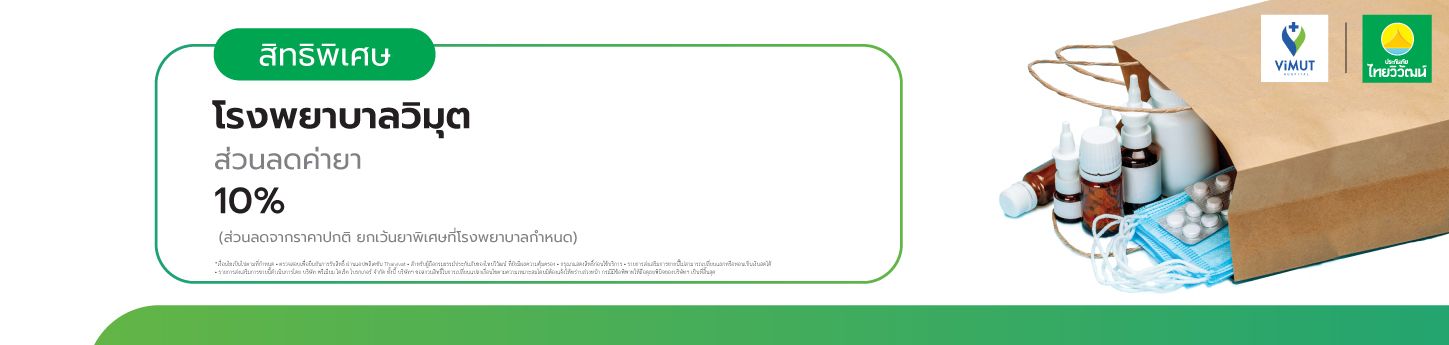 ส่วนลดค่ายา 10% โรงพยาบาลวิมุต สำหรับลูกค้าปัจจุบันที่กรมธรรม์ยังมีผลความคุ้มครองอยู่ ณ วันที่กดรับสิทธิ์ หรือทำรายการซื้อ หรือต่ออายุประกันภัย และชำระเบี้ยฯ ครบถ้วน